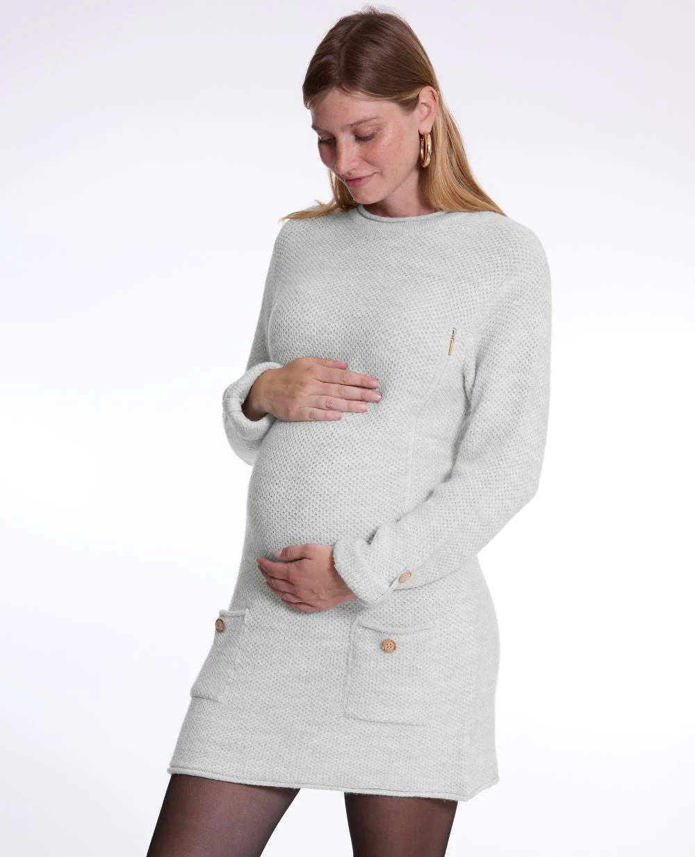 La robe pull de grossesse et d'allaitement Honey Gris Perle allie douceur et praticité grâce à sa maille européenne et ses 2 fermetures invisibles pour allaiter.
