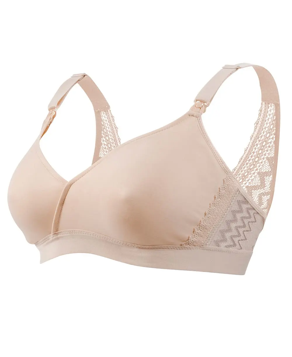 Le soutien-gorge de grossesse et d'allaitement Serena blush allie confort absolu et élégance grâce à sa dentelle italienne géométrique et sa matière double face innovante.