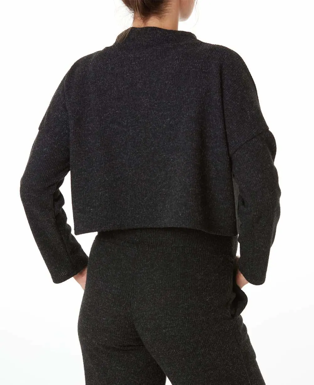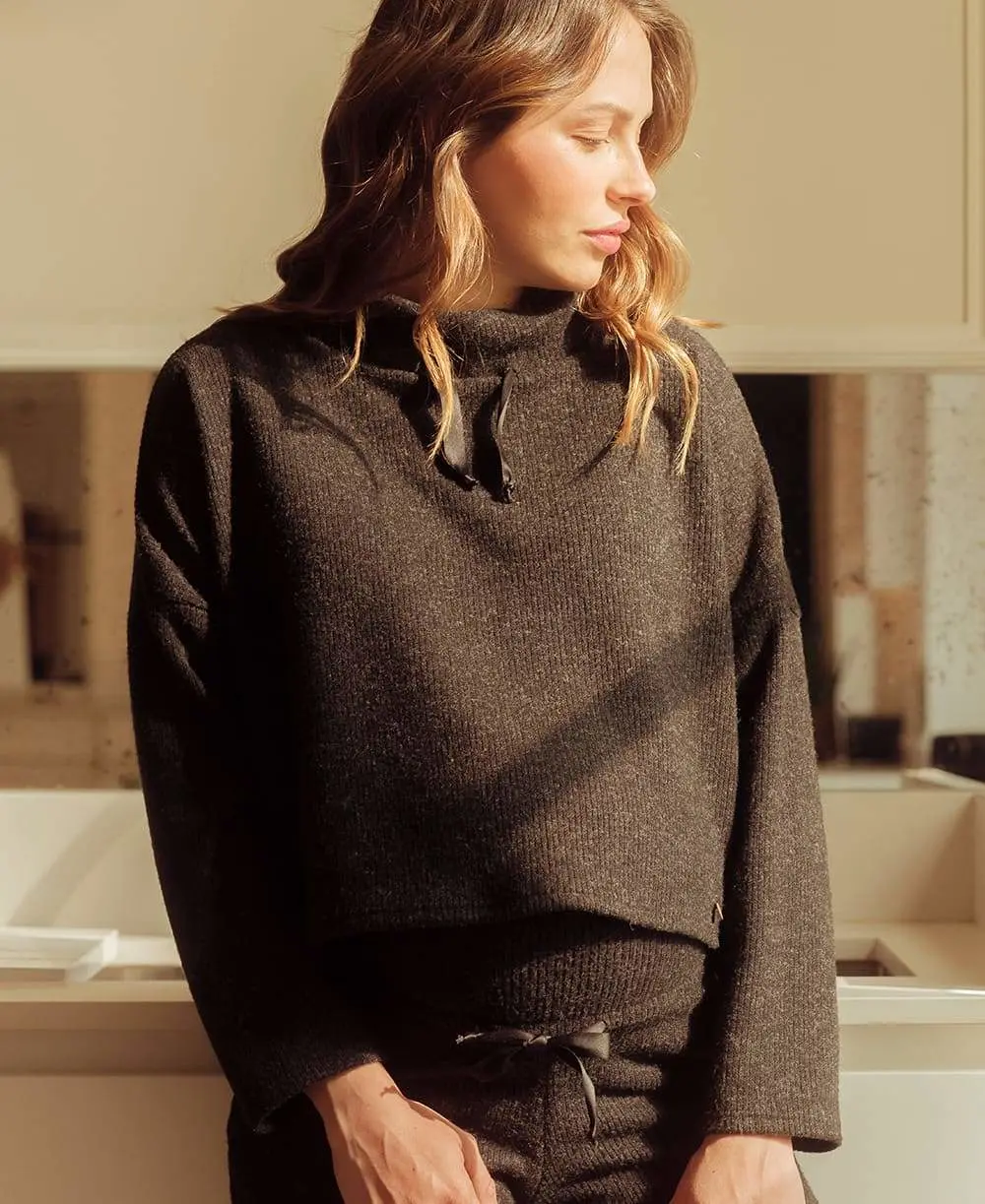 Le sweat crop top de maternité et d'allaitement Sweet Home NOIR allie confort absolu et style grâce à sa maille côtelée ultra douce et son col montant réglable.